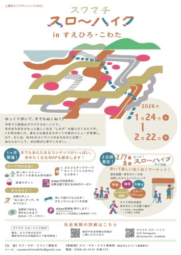 上諏訪エリアチャレンジ2025として「スワマチ スロ~ハイクinすえひろ・こわた」が1月24日(土曜日)から2月22日(日曜日)に始まります!